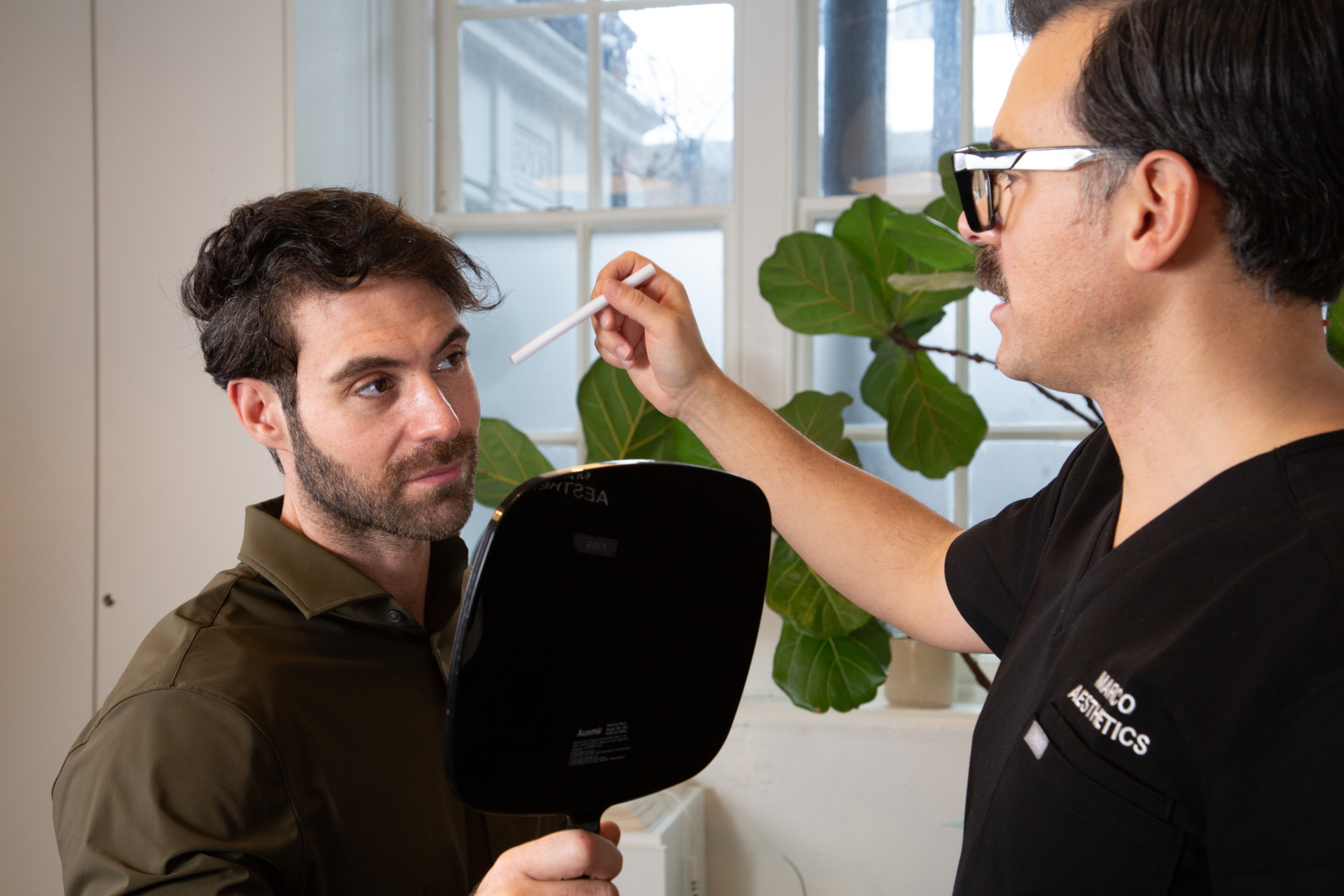 Marco discusses the results of a treatment with a client in his Shoreditch, London studio